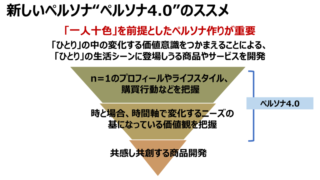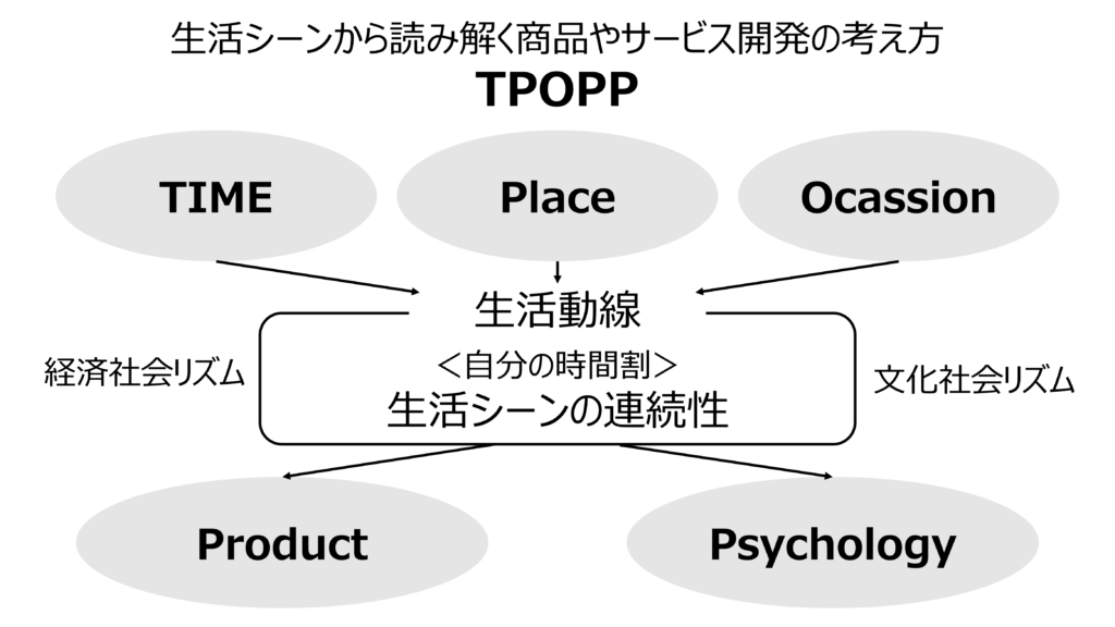 そして、こうした食生活の変化に対応した、次世代の食の商品開発は、「一人十色」を前提としたペルソナ(ペルソナ4.0)を作るだけではなく、生活者の行動観察から商品開発フレーム「TPOPP」を考えることで可能だと提唱している。