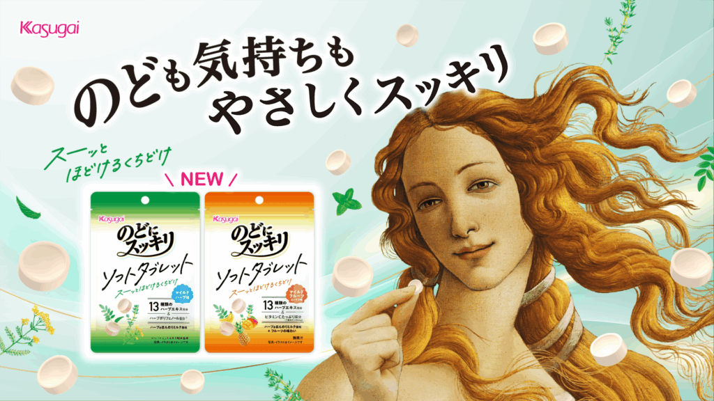のどを労る「ソフトタブレット」という新規性や、持ち歩きしやすい利便性、口どけのよさによる連食性の高さに加え、「マイルドハーブ味」にはハーブポリフェノールを、「マイルドフルーツミックス味」にはビタミンCを配合し、イメージを高めることで訴求力を強化している。